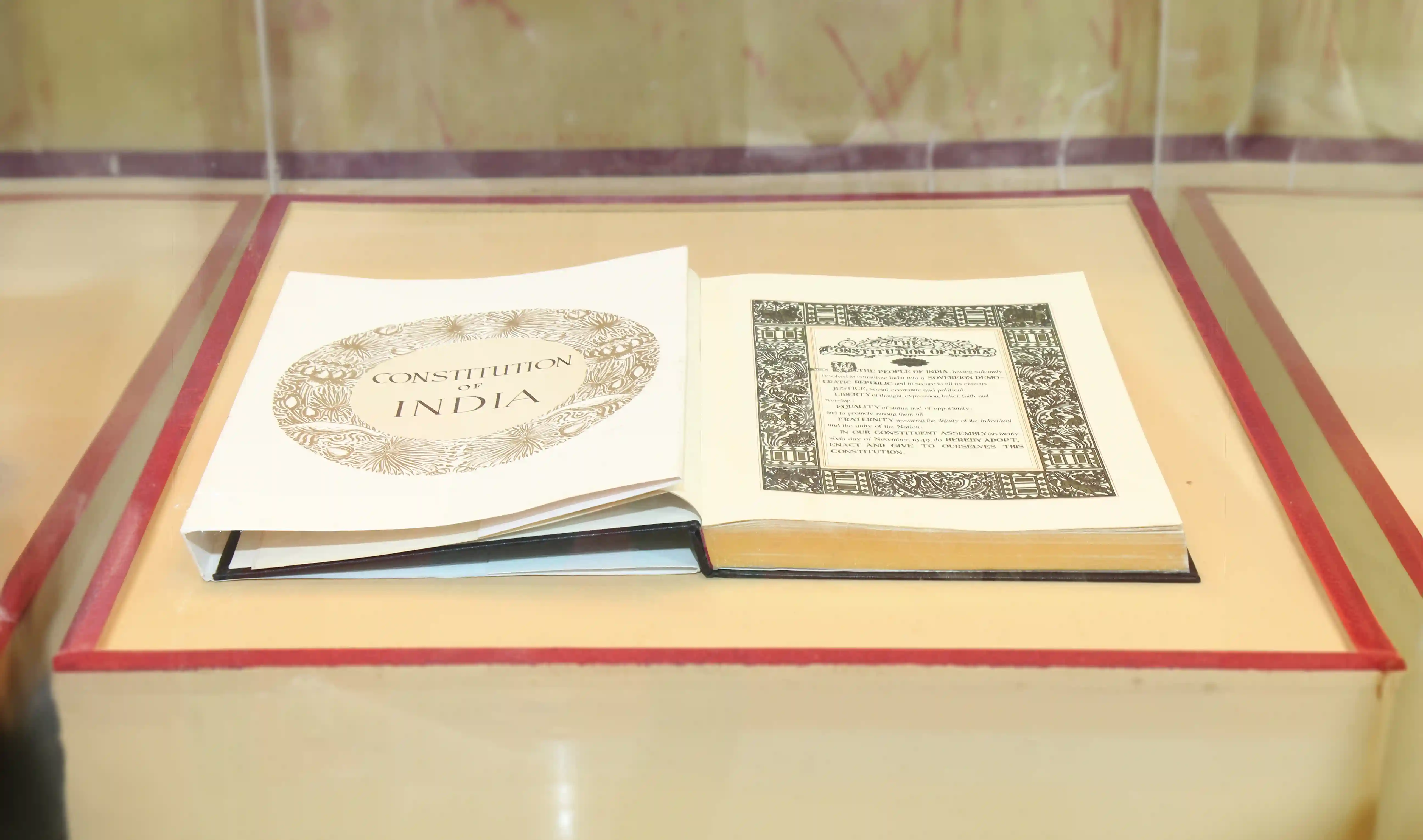The pages are bound together in black leather, with beautiful gold patterns. For 70 years, the Survey of India kept the original printing machines which printed the precious letters of the Constitution on the page. Over time, while these machines have become worn out, they have been replaced by high-tech modern machines. As a memento, the first printed copy of the constitution is still kept in the Survey of India.