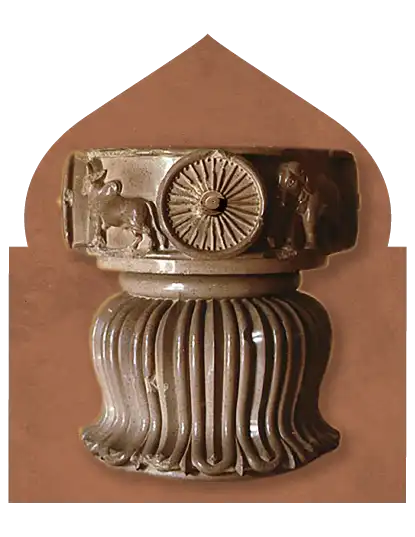 They are mounted on an abacus with a frieze carrying sculptures in high relief of an elephant, a galloping horse, a bull, and a lion, separated by intervening spoked chariot-wheels.