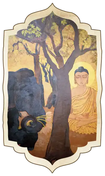 The elephant represents the origins of Buddha as dreamt by his mother at the time of his conception.