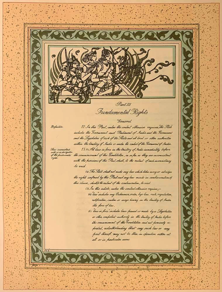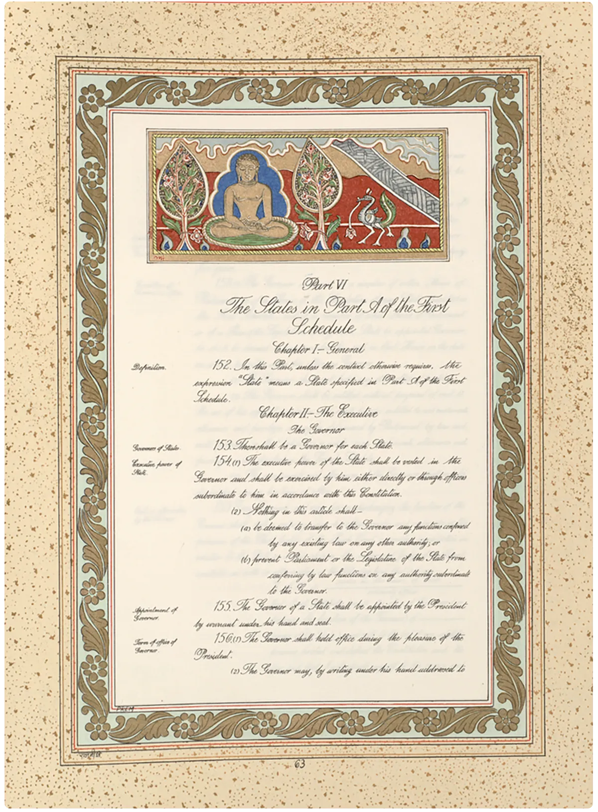 The Directive Principles of State Policy begins with the iconic scene of Arjuna and Lord Krishna’s conversation before the war.The sections of the constitution on rules that pertain to the President and Vice President is illuminated with the image of Lord Buddha’s Enlightenment.